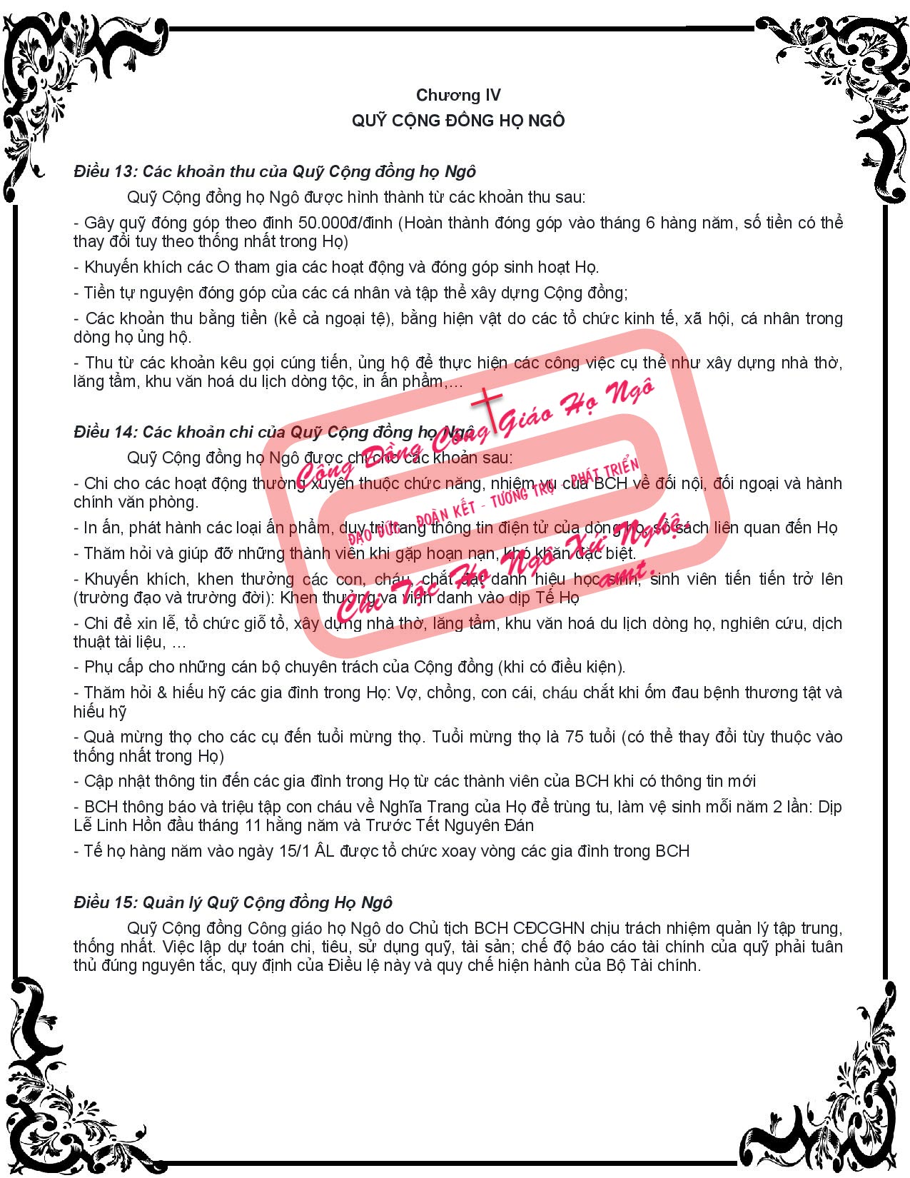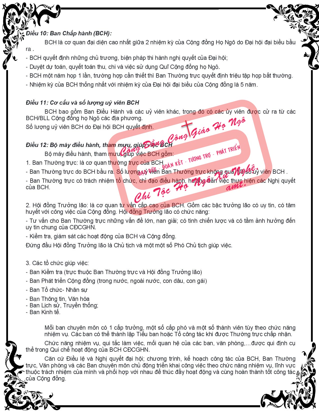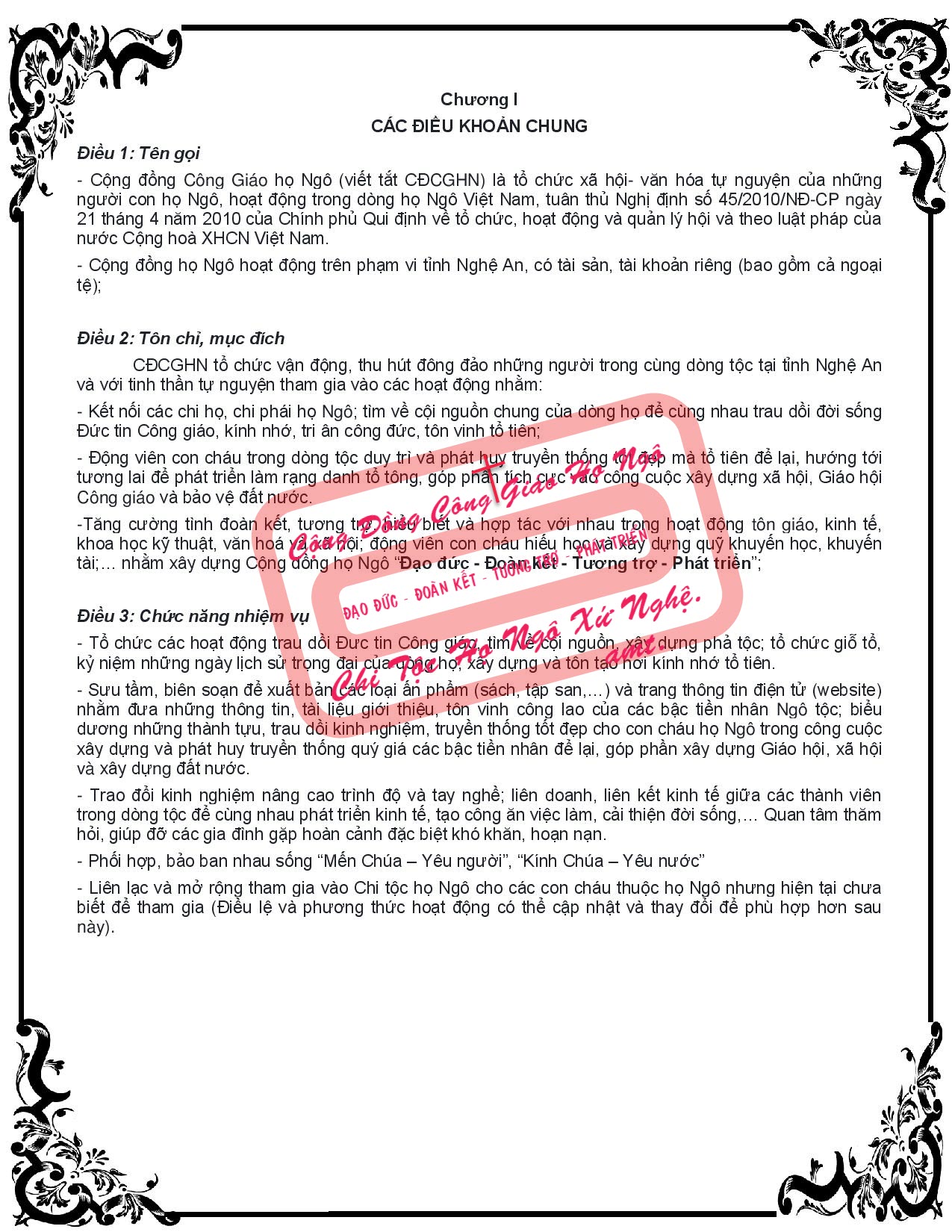 -Tăng cường tình đoàn kết, tương trợ, hiểu biết và hợp tác với nhau trong hoạt động tôn giáo, kinh tế, khoa học kỹ thuật, văn hoá và xã hội; động viên con cháu hiếu học và xây dựng quỹ khuyến học, khuyến tài;… nhằm xây dựng Cộng đồng họ Ngô “Đạo đức - Đoàn kết - Tương trợ - Phát triển”. (Trích Điều 2: Tôn chỉ, mục đích).