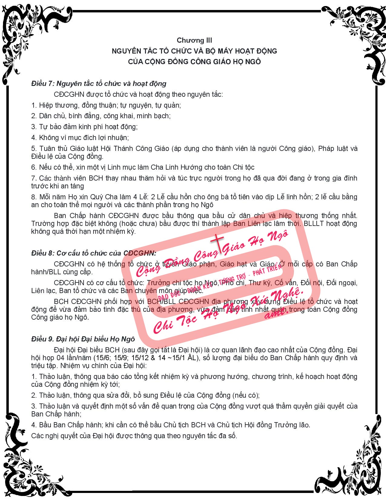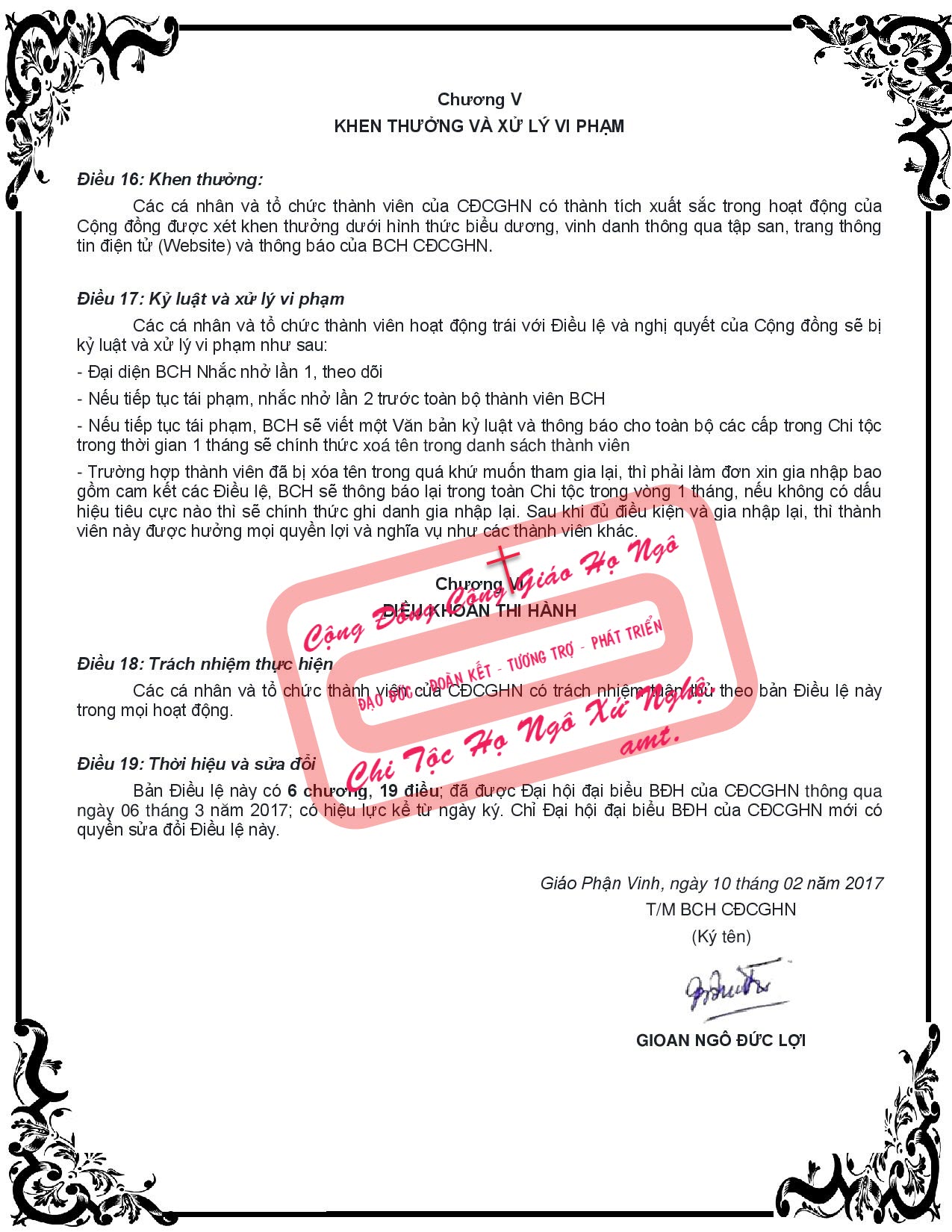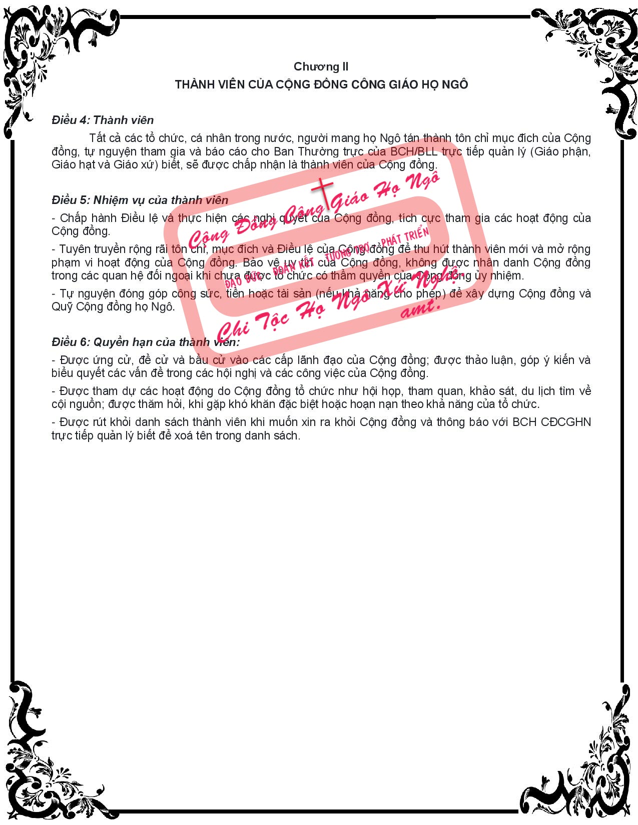 -Tăng cường tình đoàn kết, tương trợ, hiểu biết và hợp tác với nhau trong hoạt động tôn giáo, kinh tế, khoa học kỹ thuật, văn hoá và xã hội; động viên con cháu hiếu học và xây dựng quỹ khuyến học, khuyến tài;… nhằm xây dựng Cộng đồng họ Ngô “Đạo đức - Đoàn kết - Tương trợ - Phát triển”. (Trích Điều 2: Tôn chỉ, mục đích).